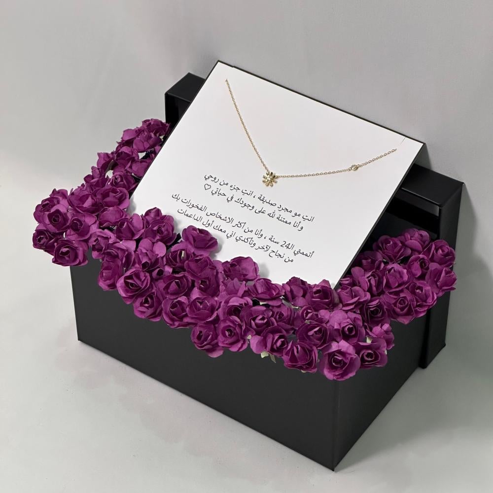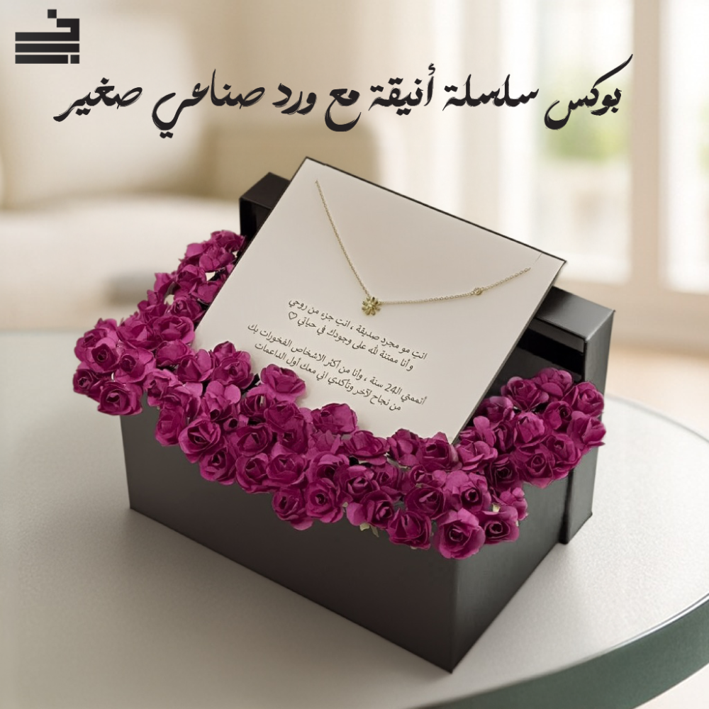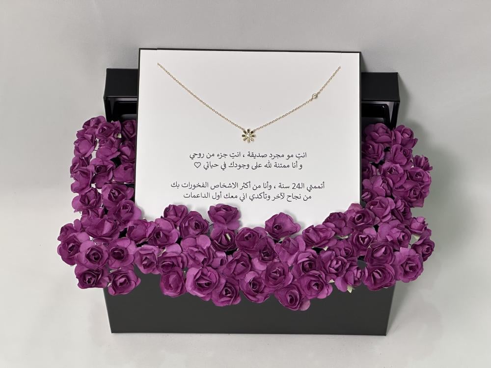 احتفل بلحظة التخرج بهدية مميزة بذوقٍ خاص. بوكس مميز يجمع بين سلسال هدية أنيق بتفاصيل ناعمة، وورد صناعي صغير فاخر. هدية تعبّر عن الفخر والامتنان .